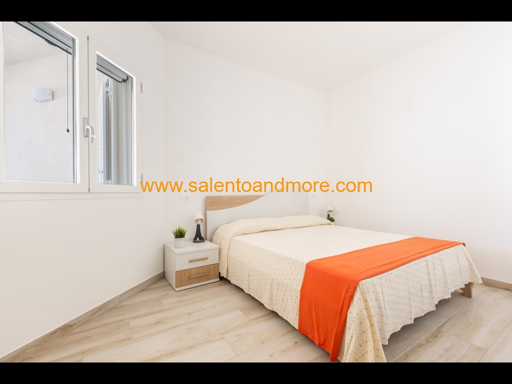 E' composto da camera matrimoniale, camera doppia, bagno completo, cucina attrezzata abitabile con divano letto matrimoniale, spazi esterni di 200mq attrezzati con divanetti, tavolo e sedie, barbecue, doccia esterna e posto auto interno al cortile.
