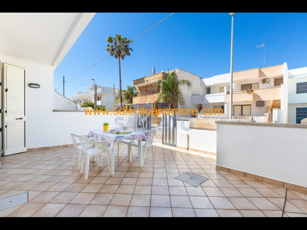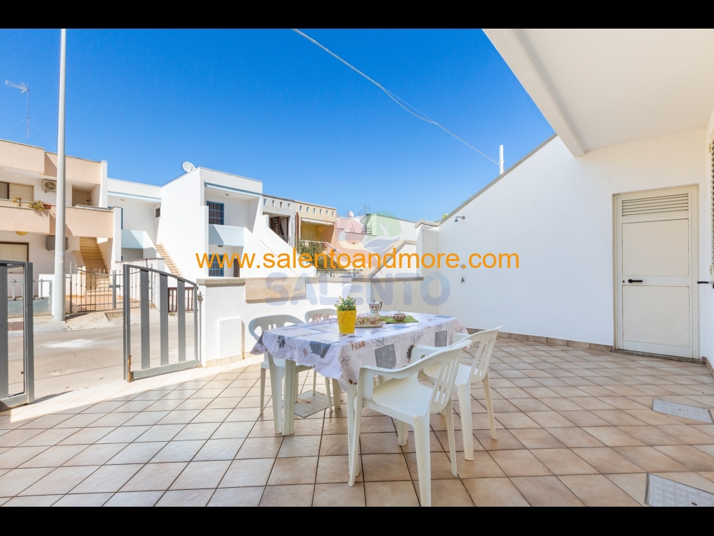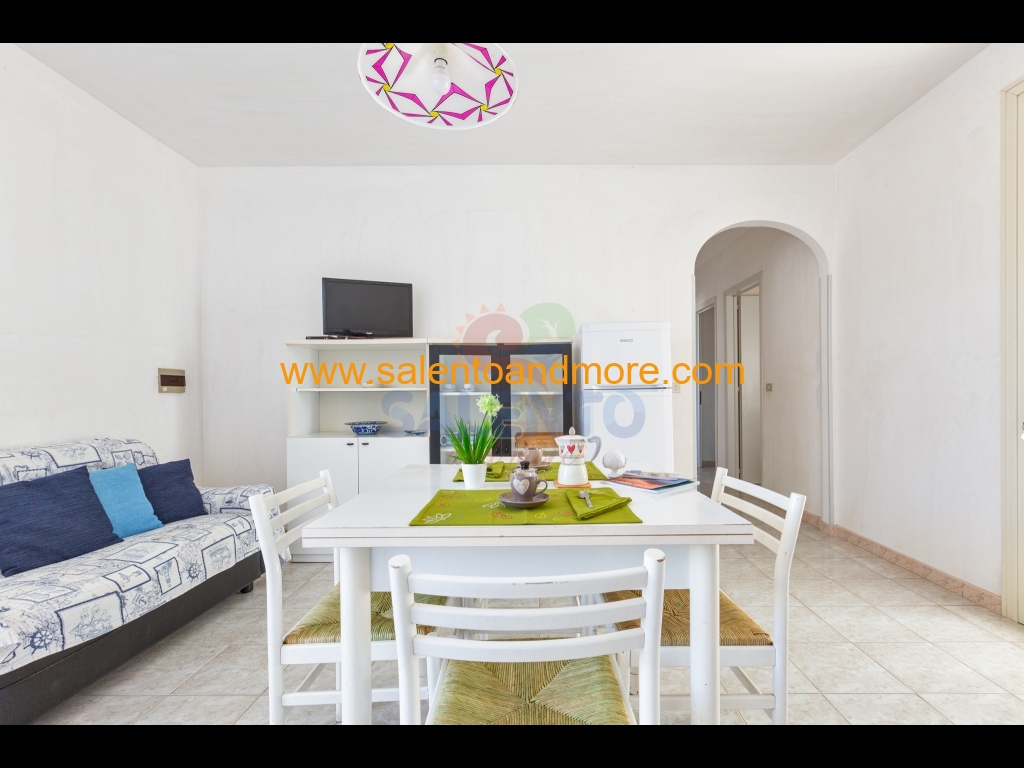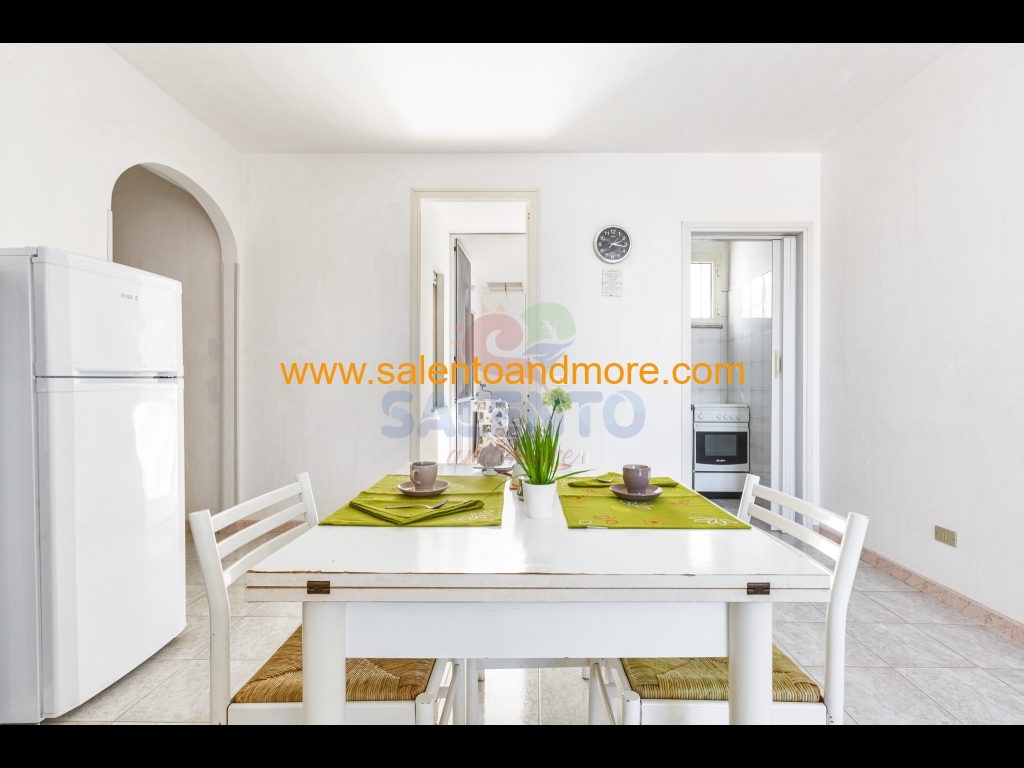 E' composto da ampia zona giorno, cucinotto, disimpegno, bagno completo, due camere da letto, una doppia e una tripla (matrimoniale e letto singolo), spazio retrostante con zona lavanderia e terrazzo antistante con doccia esterna, tavolo e sedie per poter mangiare all'aperto.