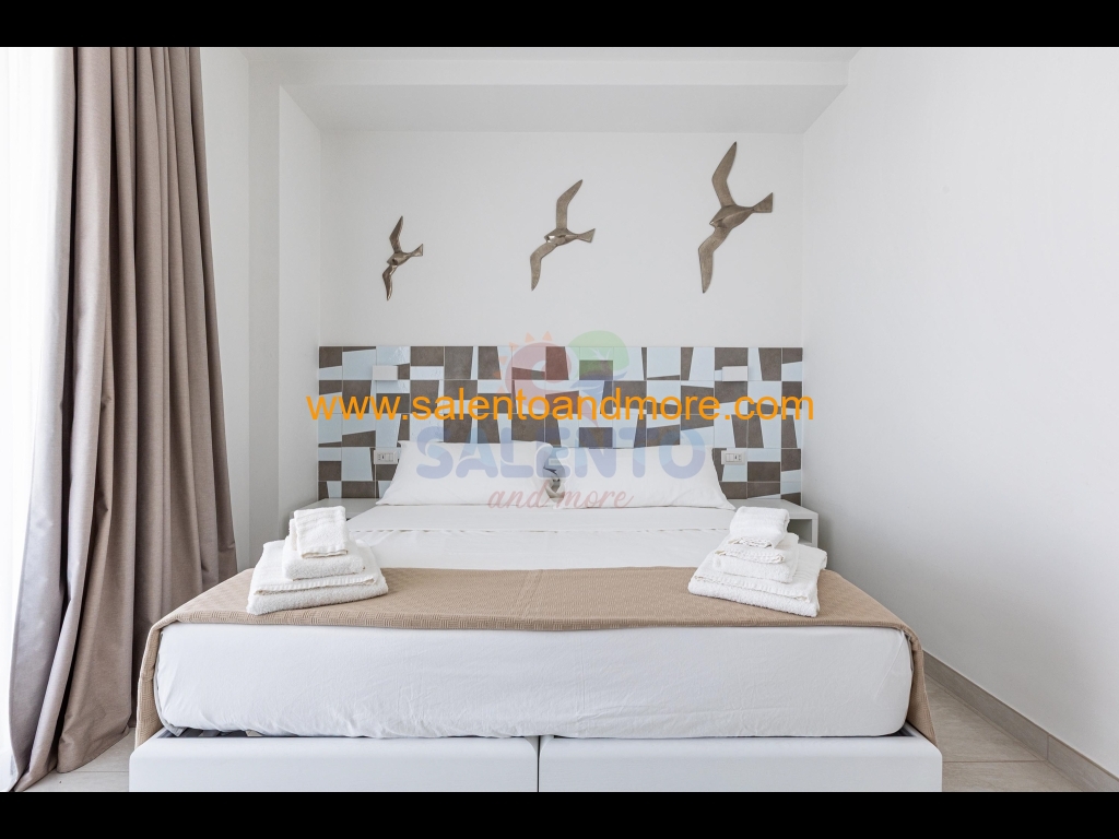 Camera matrimoniale con balcone e vista mare, situata nel nuovo complesso residenziale "Stella del Mare" a Torre Pali, a soli 100 m dalla spiaggia.