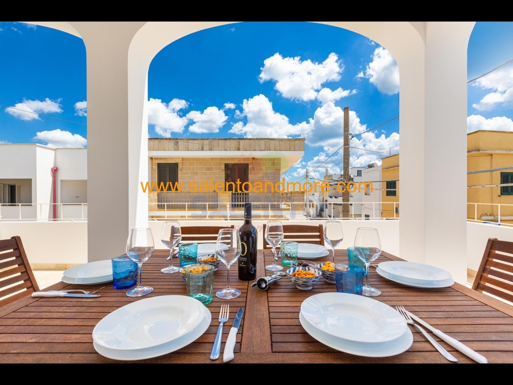 Situata al primo piano, si affaccia su tre strade con una veranda perimetrale dotata di tende per garantire ombra e privacy, attrezzata con salottino, tavolo e sedie per consumare pasti all'aperto.