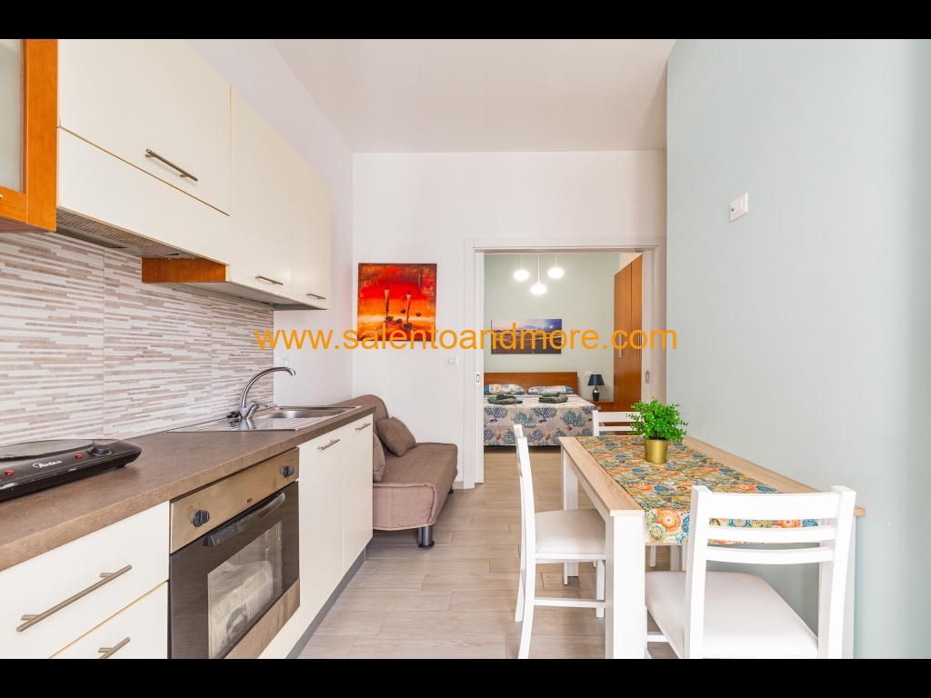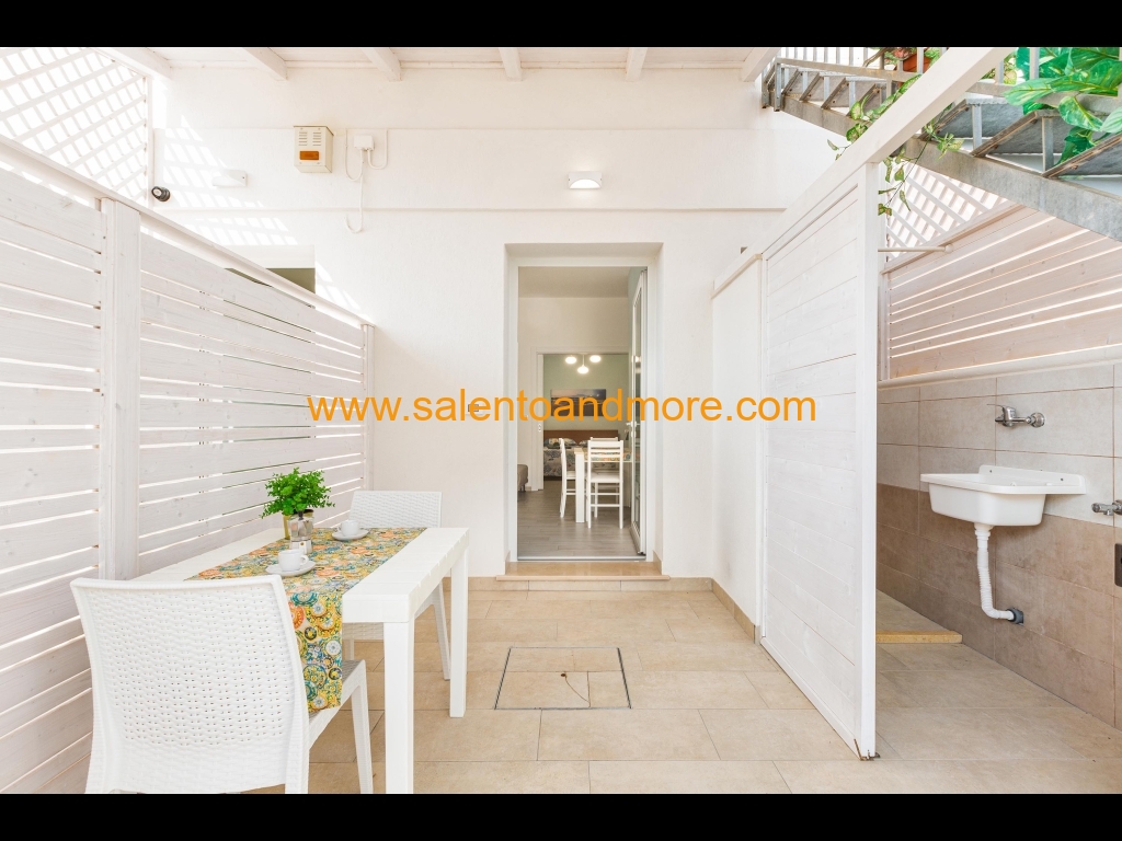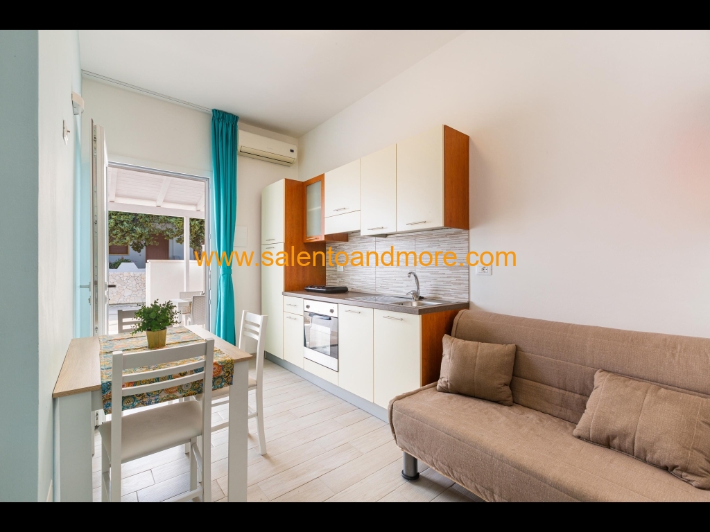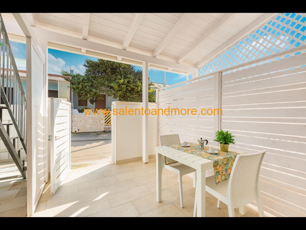 Bilocale indipendente situato a Lido Marini, marina del comune di Salve, a piano terra, composto da una camera matrimoniale, disimpegno, bagno con doccia, tinello con angolo cottura e divano letto, terrazzino antistante la casa adibito anche per pranzo /cena all'aperto.