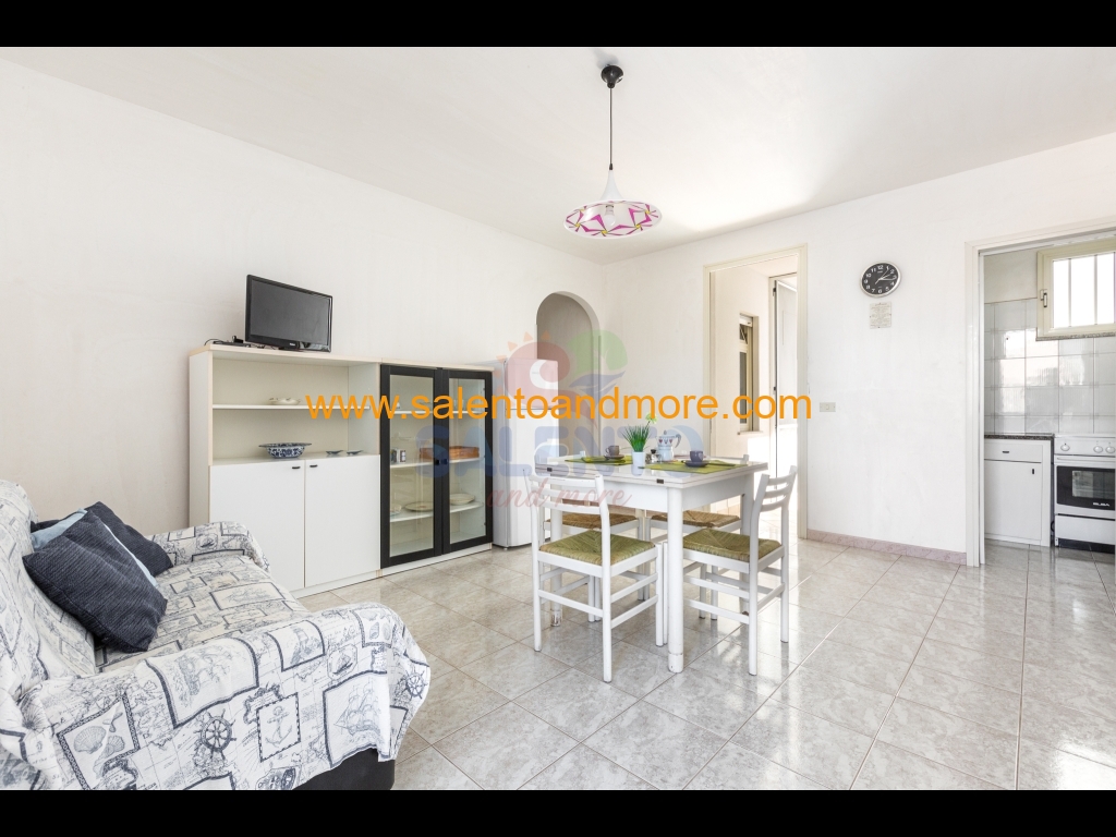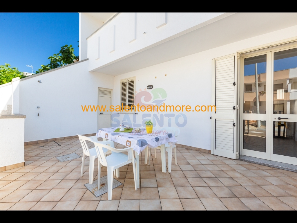 E' composto da ampia zona giorno, cucinotto, disimpegno, bagno completo, due camere da letto, una doppia e una tripla (matrimoniale e letto singolo), spazio retrostante con zona lavanderia e terrazzo antistante con doccia esterna, tavolo e sedie per poter mangiare all'aperto.