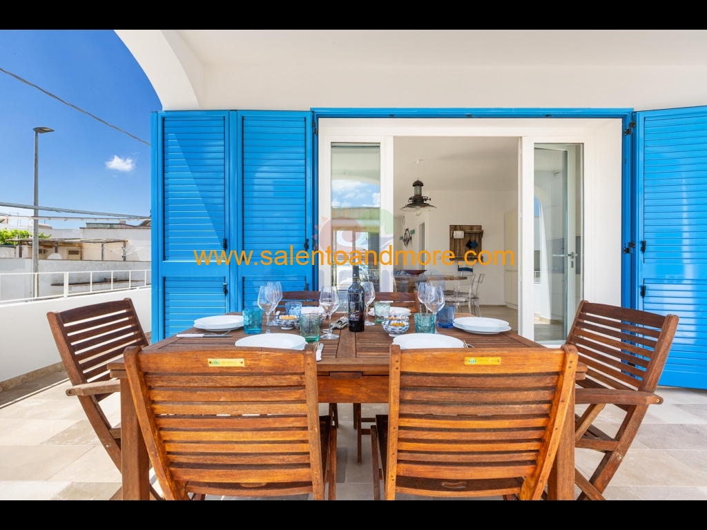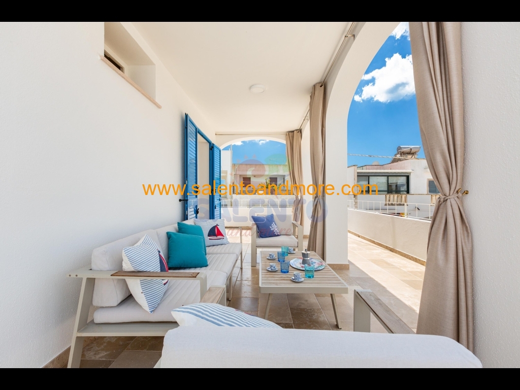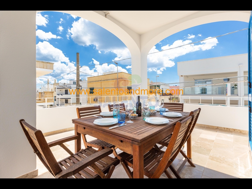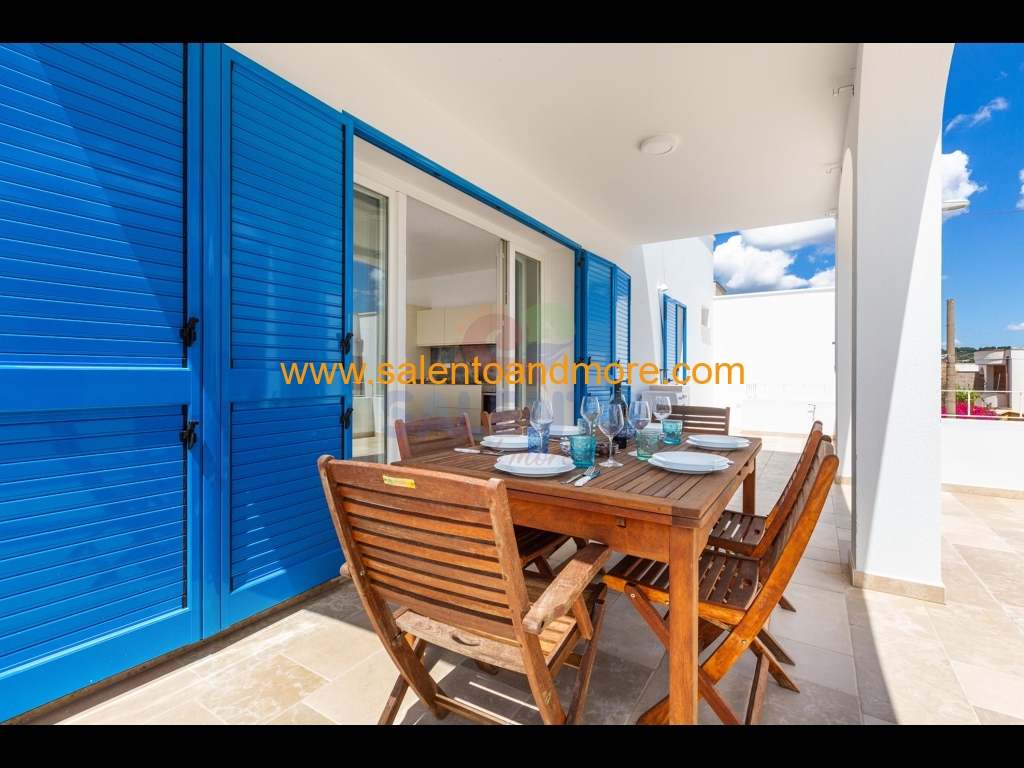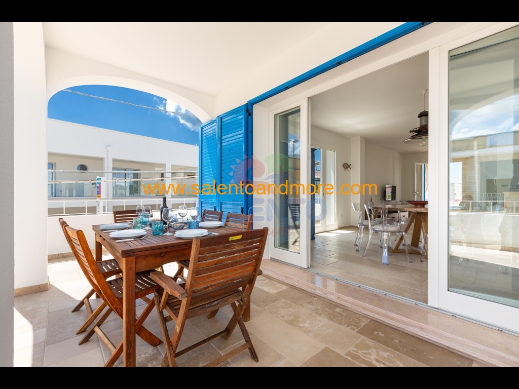 Situata al primo piano, si affaccia su tre strade con una veranda perimetrale dotata di tende per garantire ombra e privacy, attrezzata con salottino, tavolo e sedie per consumare pasti all'aperto.